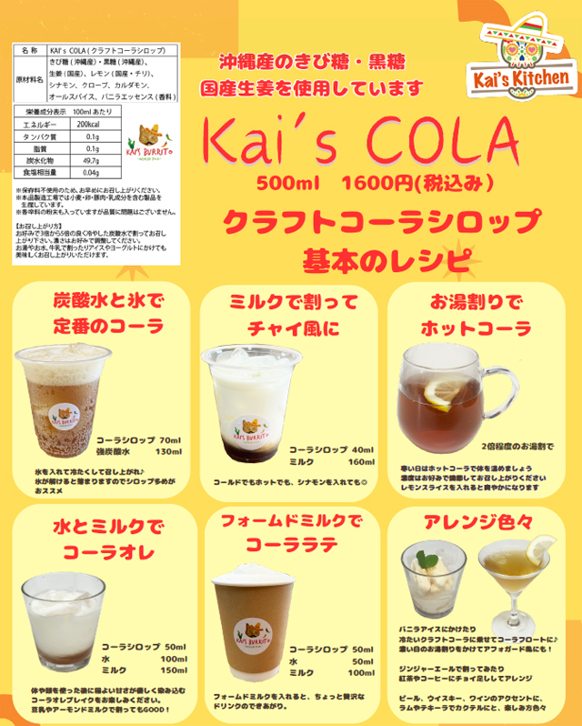 カイズキッチンオリジナルレシピでスパイスを砕き、煮詰めて作るクラフトコーラ。沖縄産のきび糖・黒糖。国産の生姜にこだわって作っています。